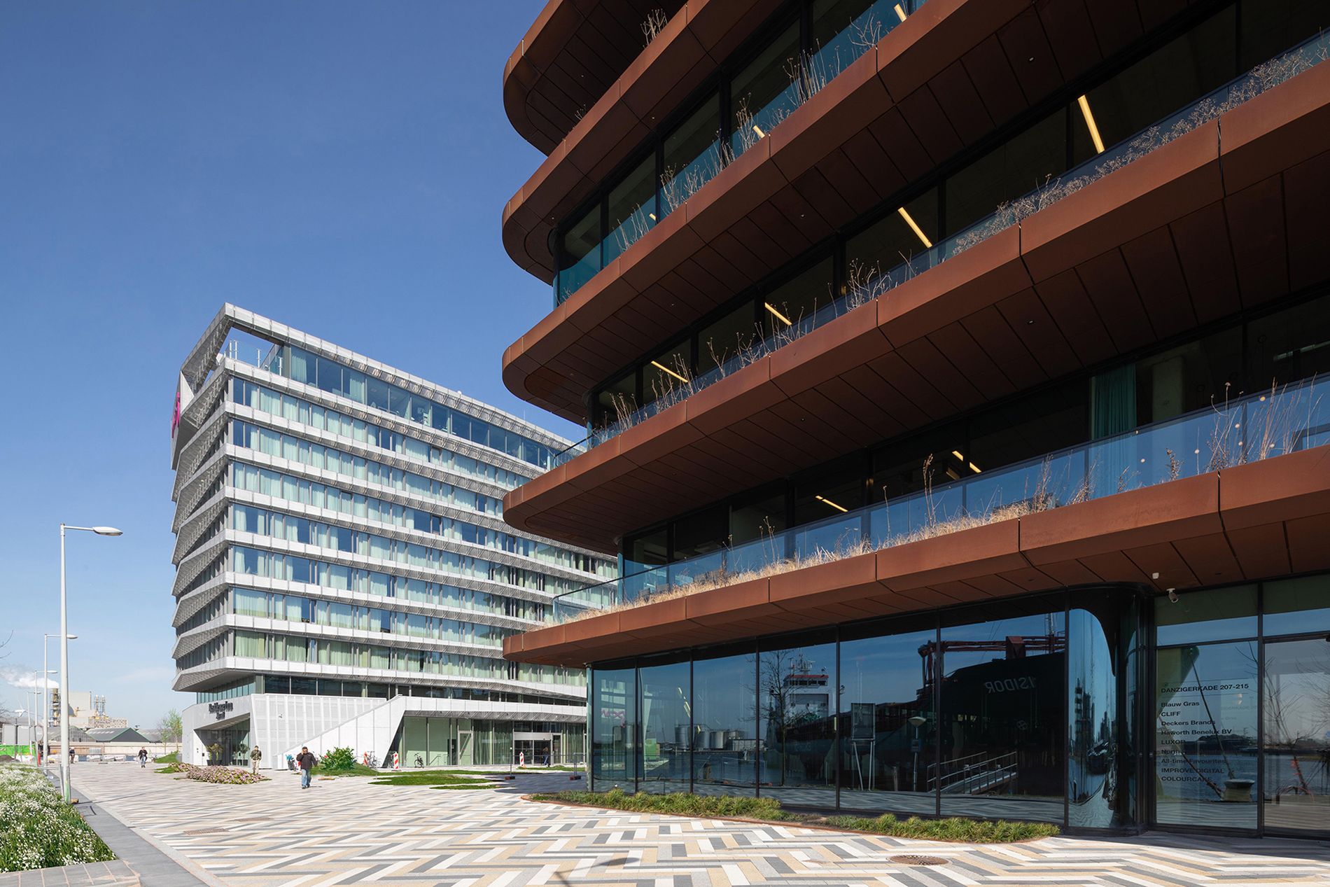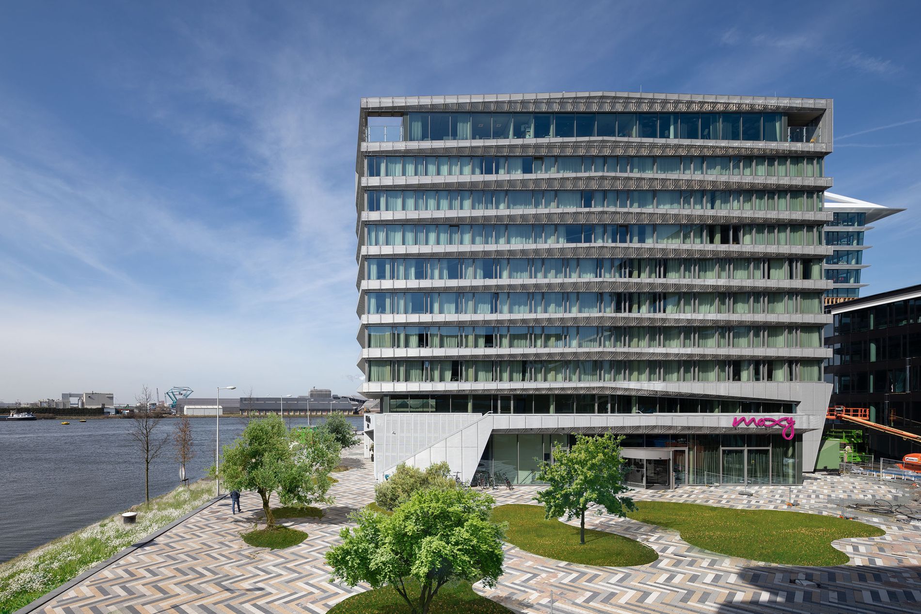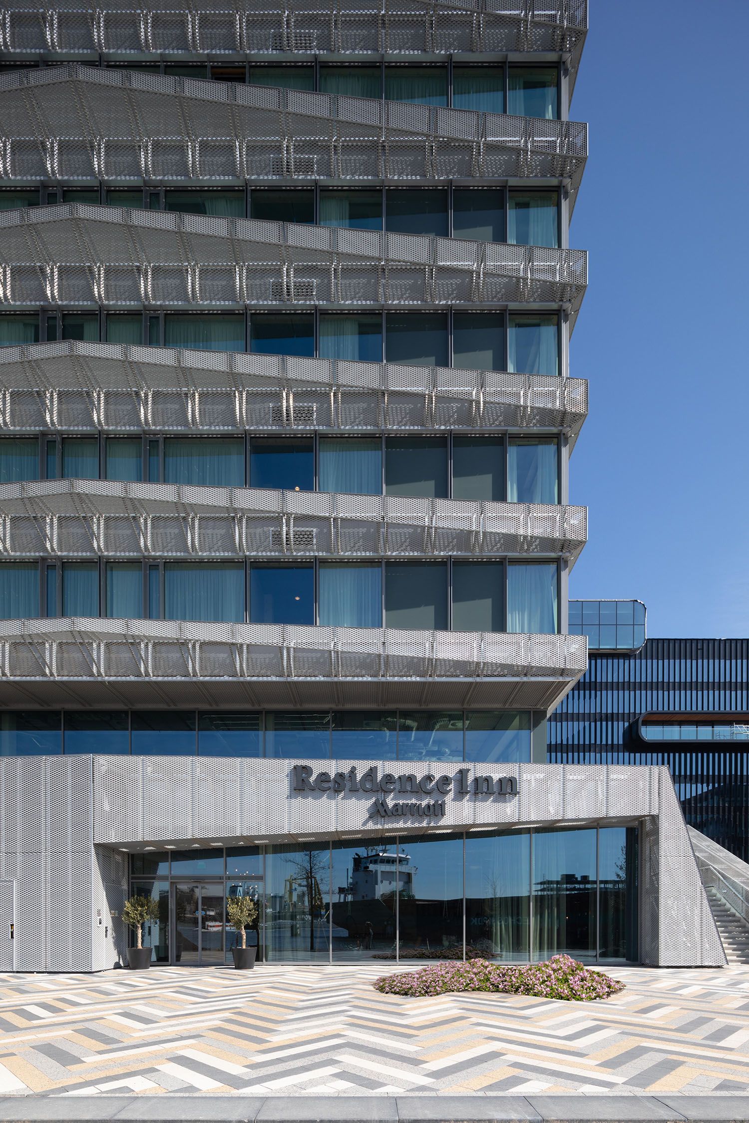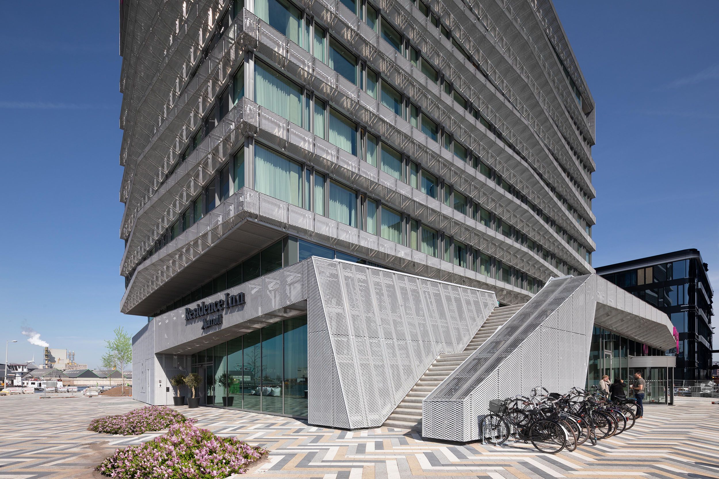 Het gebouw torent uit boven een plein dat de nodige lucht toevoegt aan de dichtbebouwde pier. Het plein is vormgegeven als stedelijke schakel tussen het hotel en de omliggende bebouwing. Het zorgvuldige patroon van zwarte, witte en beige klinkers geeft het een vrolijke uitstraling.