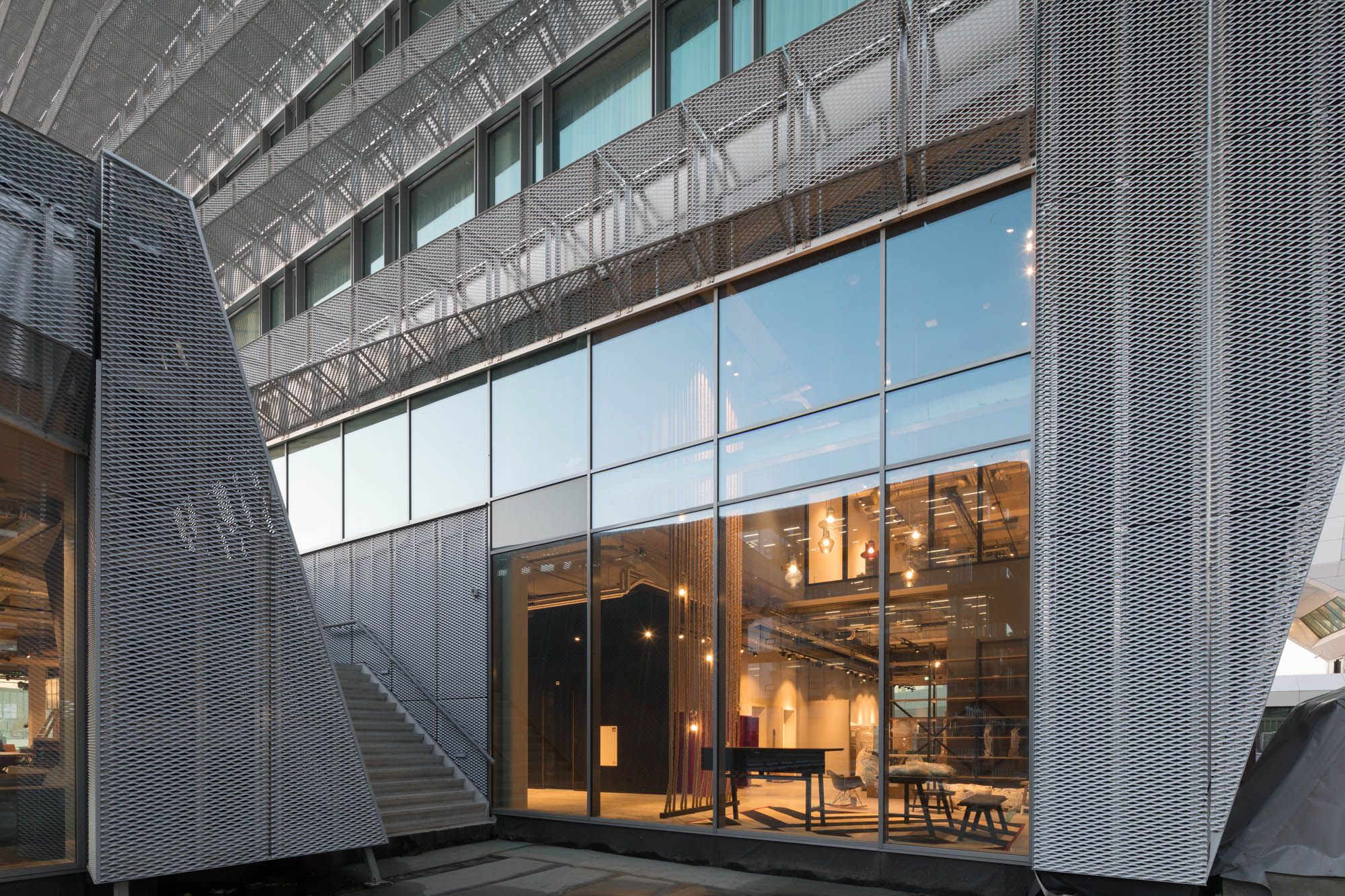 Het bouwvolume heeft een rechthoekige basis van staal. Daaromheen is een gevelafwerking toegevoegd van afwisselend uitkragende en taps toelopende stalen korven. Die geven het een industriële uitstraling die past bij de buurt. 's Avonds maakt geïntegreerde verlichting het gebouw tot een paars opgelicht baken aan het IJ.