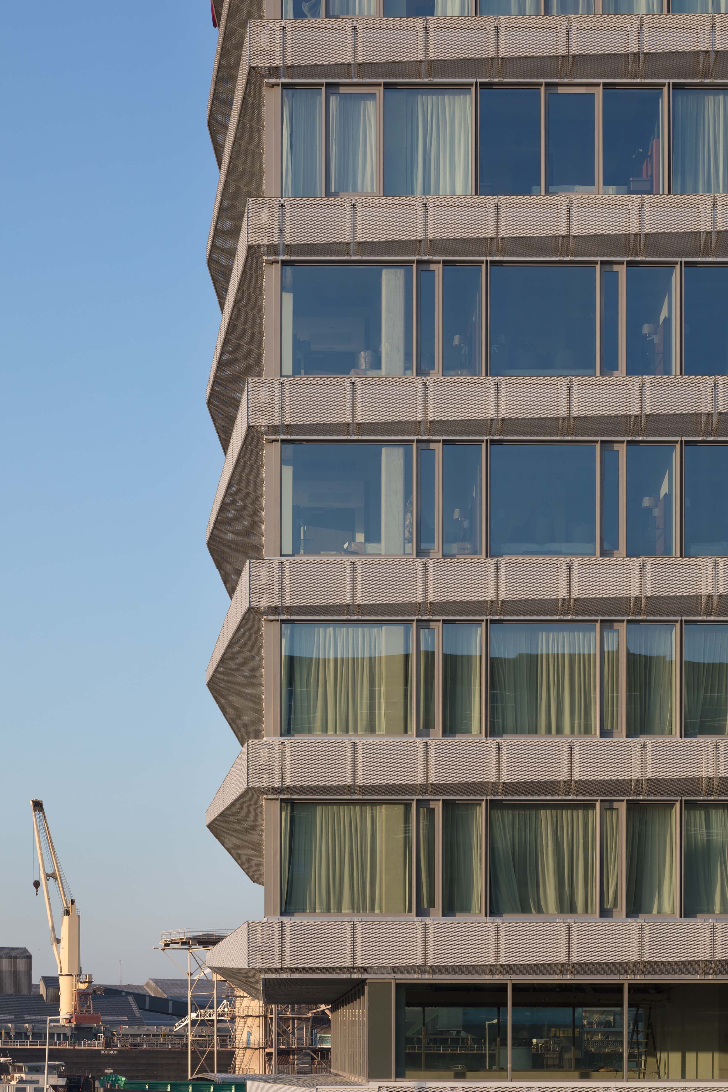 Hotel Houthavens verenigt een betaalbaar driesterrenhotel en een extended-stay formule met ruime appartementen. Het ontwerp bestaat in de basis uit een eenvoudig bouwvolume, maar heeft volop dynamiek dankzij de stalen cassettegevel die ’s avonds opvallend is aangelicht.