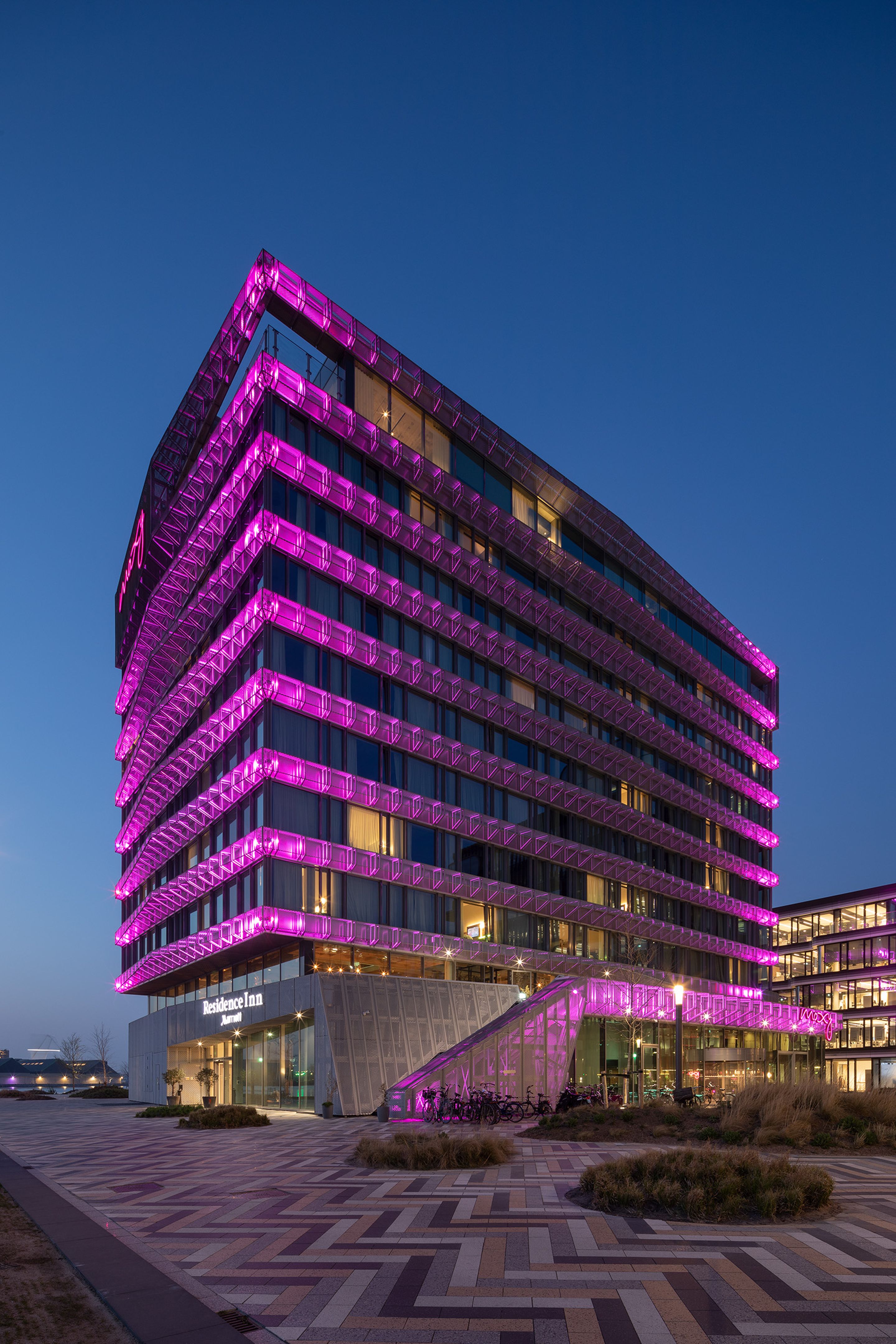 De hotelreceptie met bar bevindt zich op de begane grond; de extended-stay appartementen hebben een eigen ingang die leidt naar een lobby bovenin het gebouw. Via een buitentrap naar de eerste verdieping bereiken gasten het terras bovenop de plint dat uitkijkt over het plein.