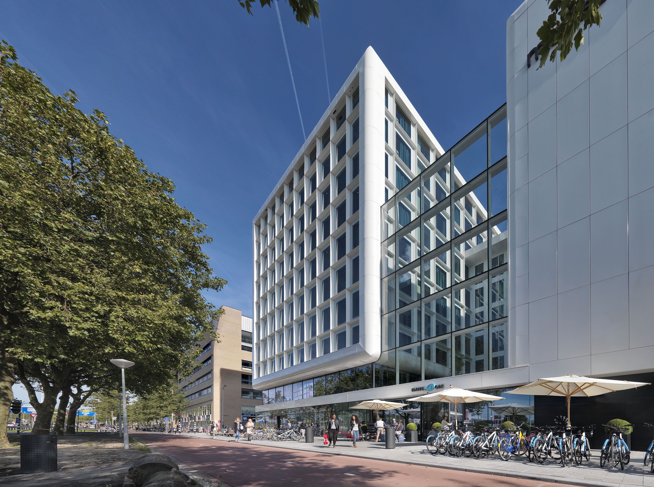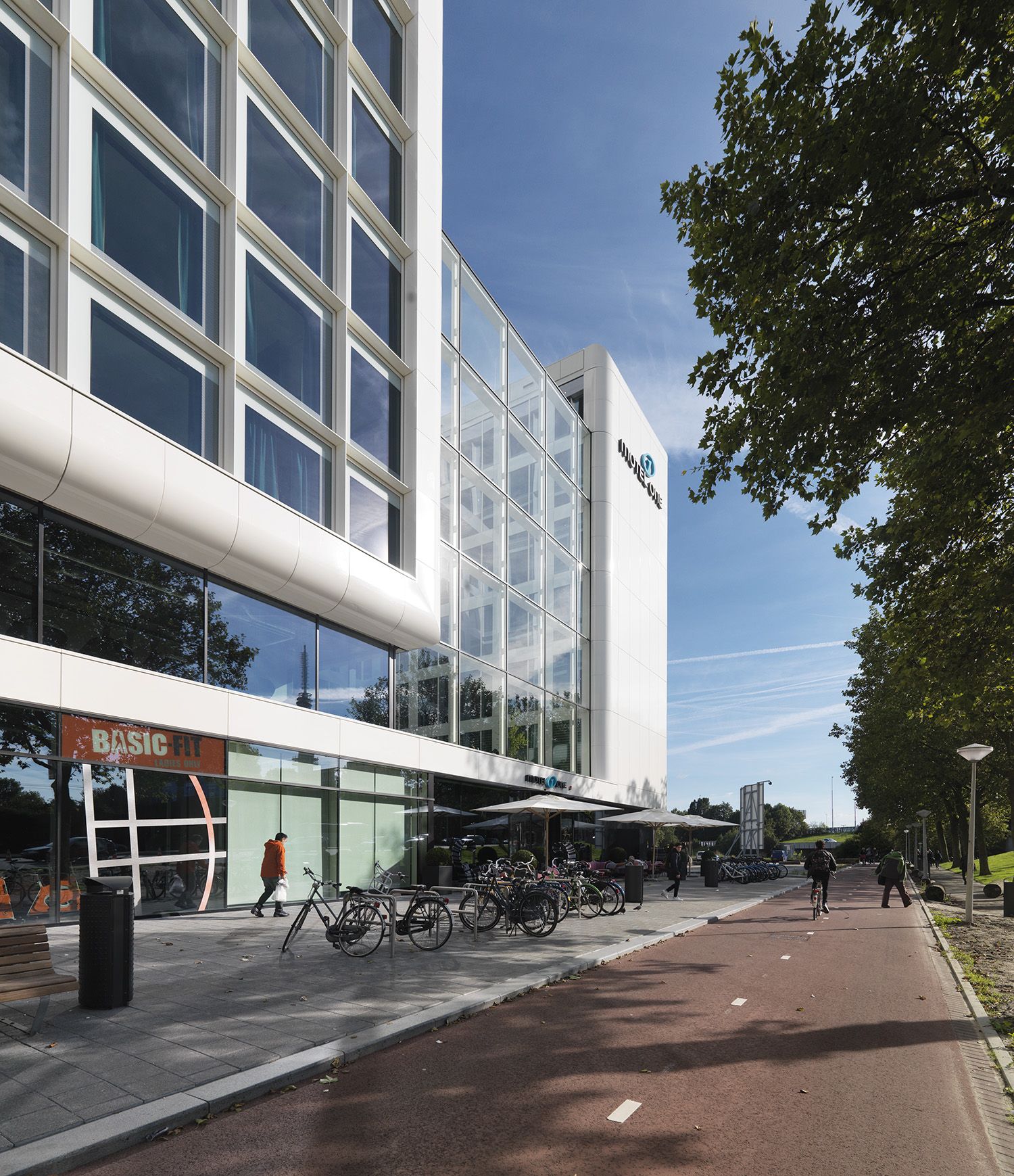 De kubus refereert in ontwerp naar congrescentrum RAI aan de overzijde van de straat. Deze witgetinte ‘Rubik’s Cube’ heeft een driedimensionaal effect dankzij het schaduwspel van de kozijnen, de gezeefdrukte glasranden in de ramen en de afgerond aluminium omlijsting.