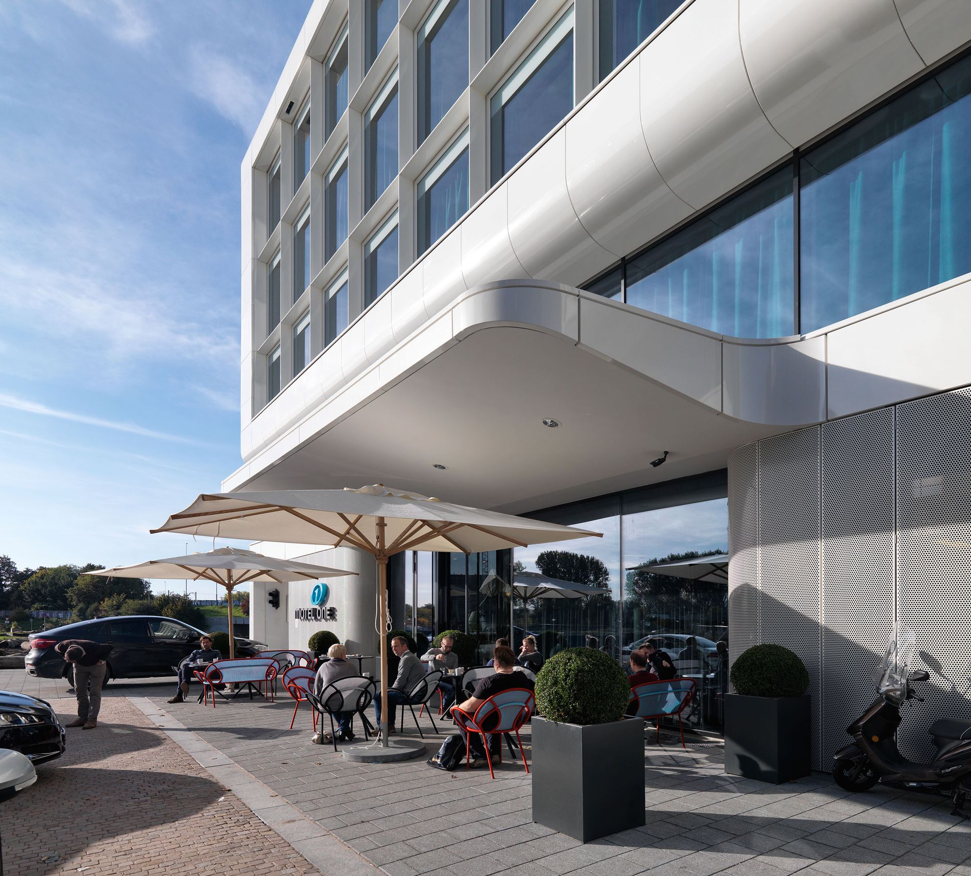 Motel One ligt aan de Europaboulevard, een drukke stadsstraat die een impuls kreeg met de komst van enkele beeldbepalende gebouwen. Het ontwerp onderscheidt zich van de omringende architectonische krachtpatsers dankzij de compacte, zwevende kubusvorm en hoge duurzaamheidsambities.