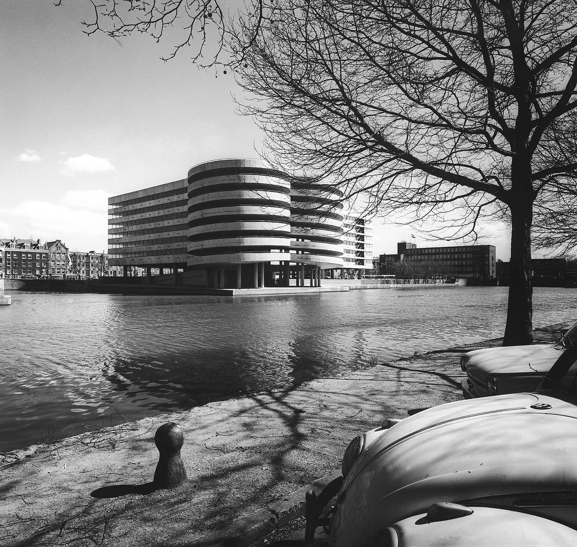 Het gebouw is uitgevoerd in gewapend beton met prefab geveldelen en horizontale glasstroken. De dubbele spiraalvormige hellingbaan aan de achterzijde van het gebouw zweeft deels boven de gracht. Deze twee iconische curves staan bekend als ‘de billen van Zanstra’.