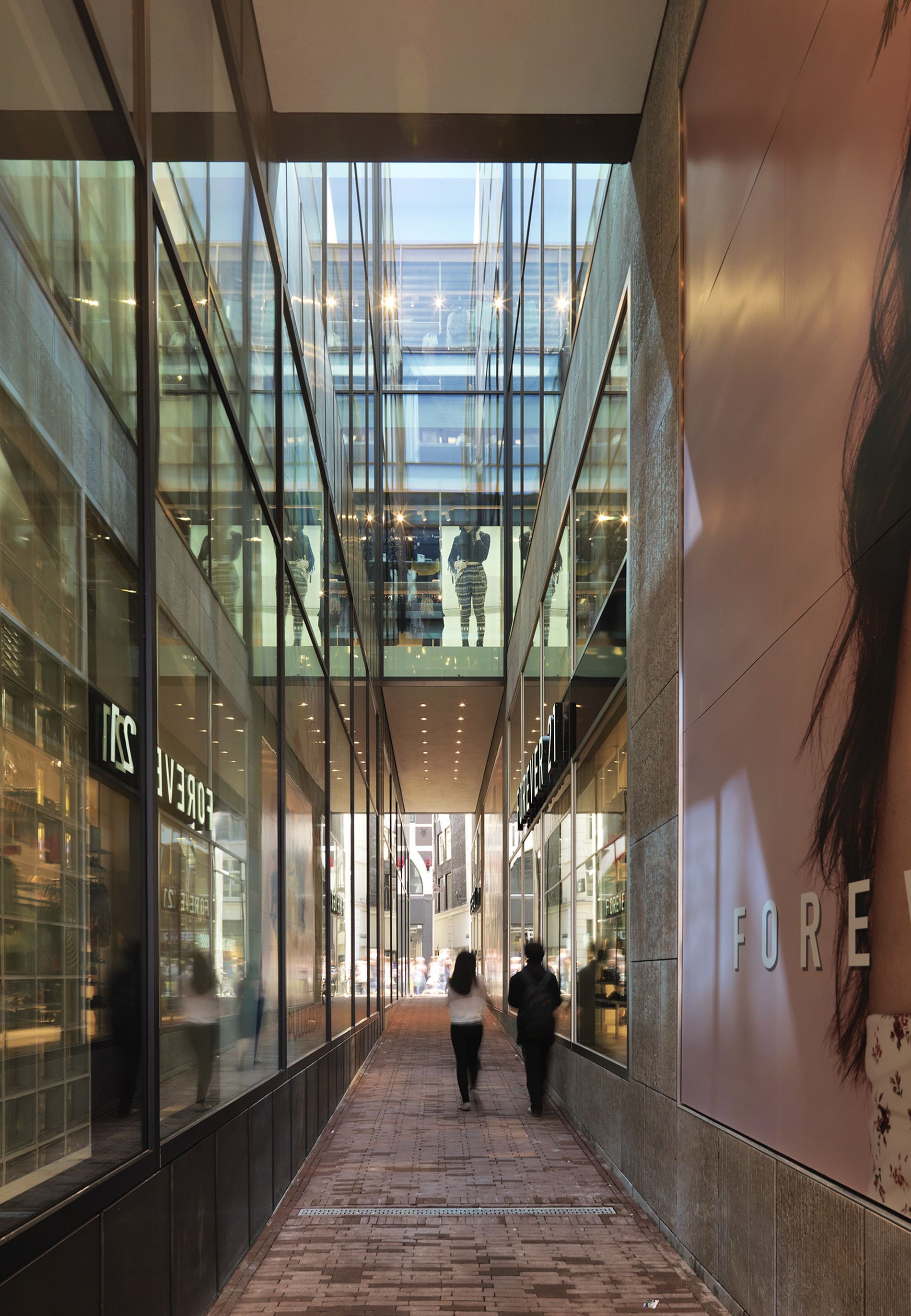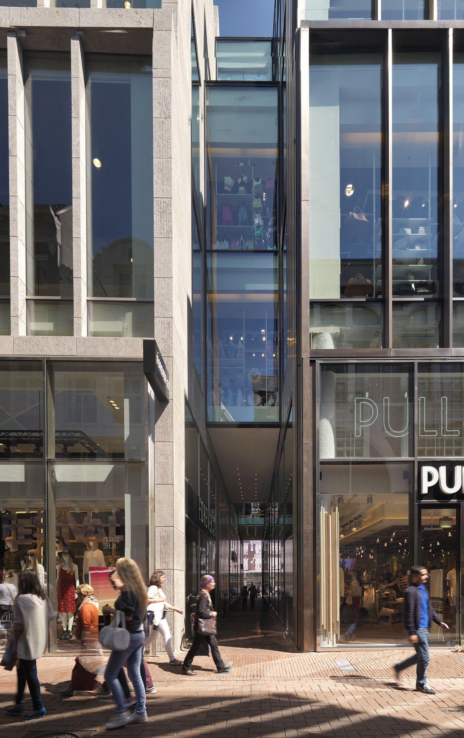 De glazen gevels aan weerszijden van de steeg hebben hetzelfde ritme, maar de materialisering benadrukt het verschil tussen de historische kavels. Links van de steeg is de gevel gemaakt van gebruineerd brons, rechts van verruwd, zandkleurig kalksteen.