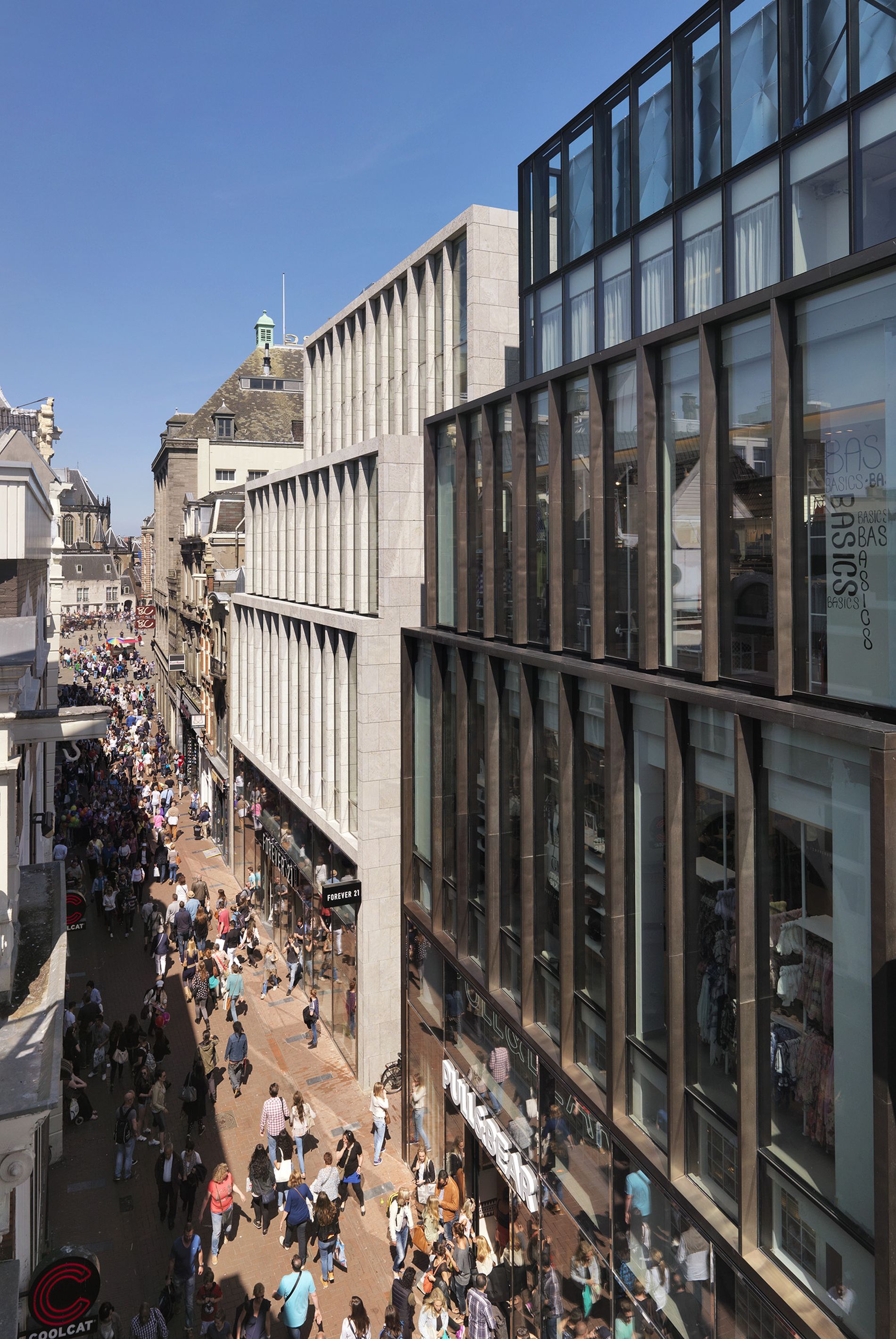 Drie van de vloeren uit het bestaande casco zijn verruild voor twee hogere verdiepingen, passend bij de hedendaagse winkeleisen. De overspanning van de steeg is teruggelegd ten opzichte van de gevel en het interne pleintje is verwijderd, wat beter past bij de historische stadsstructuur.