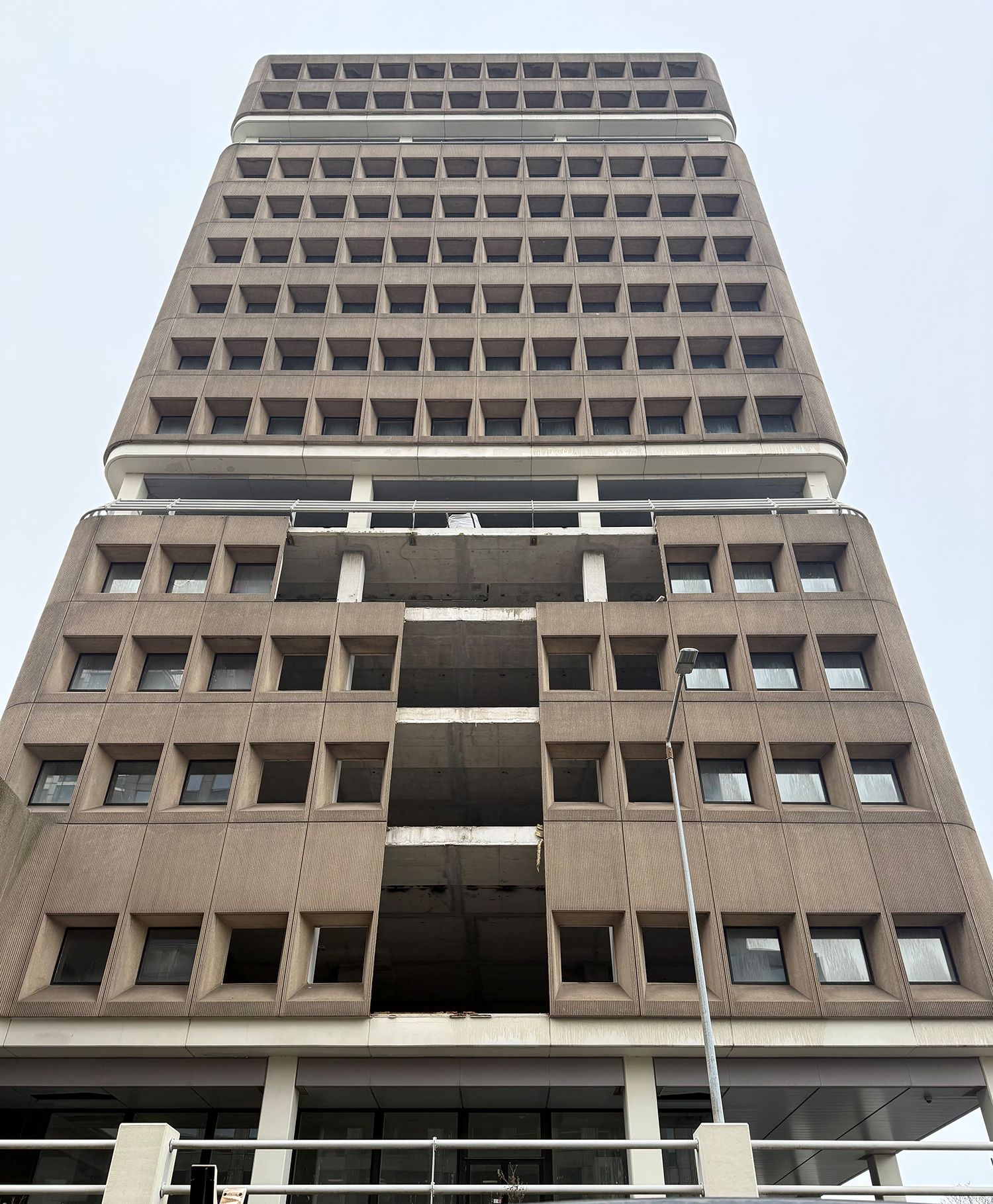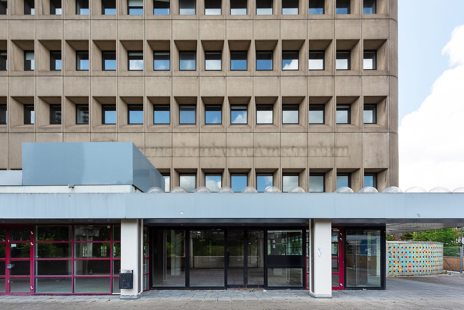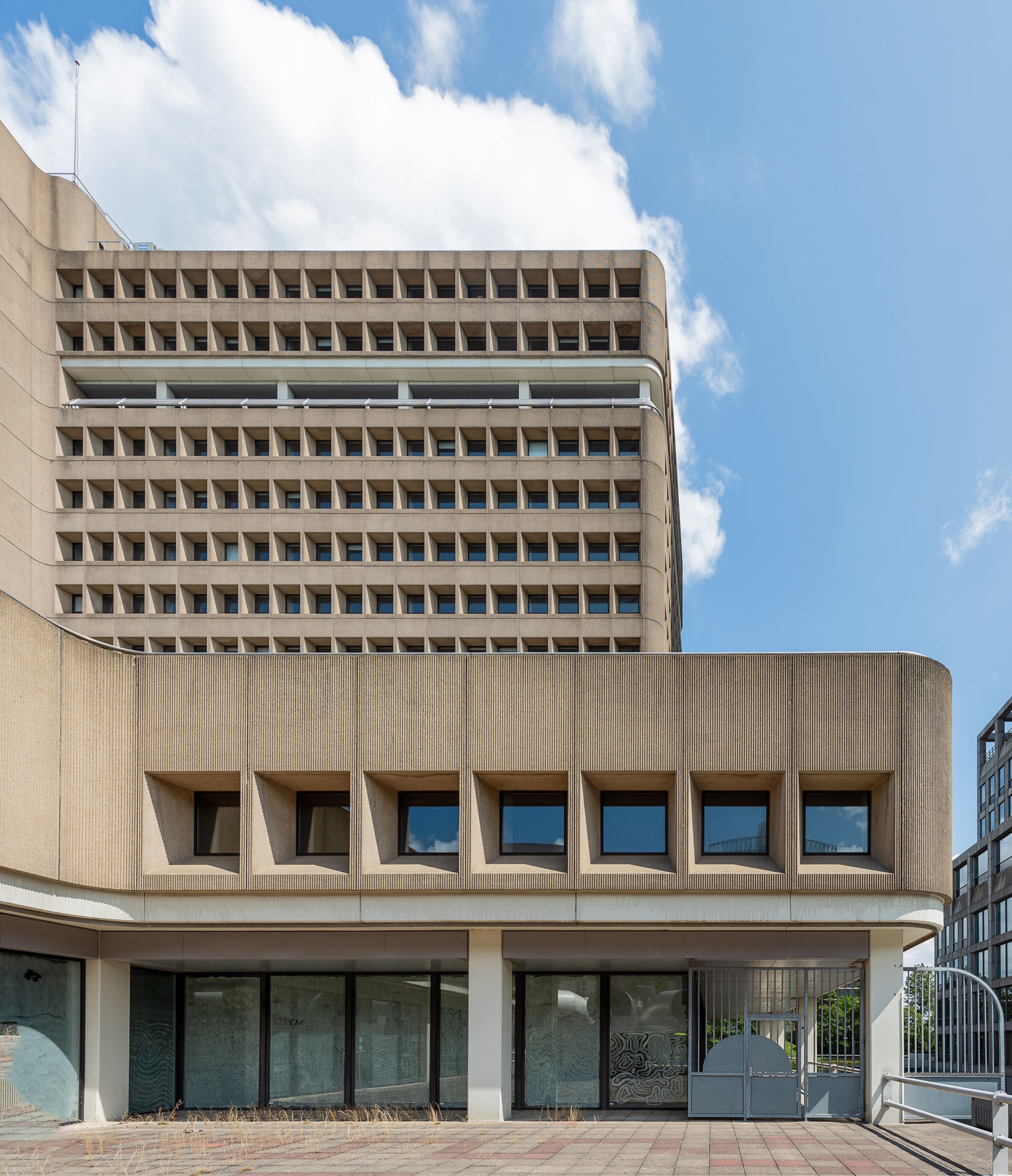 De expressieve gevel geeft het gebouw een onverwoestbare uitstraling en bestaat uit prefab elementen van grindbeton met diepliggende ramen en cannelures, die in een repetitief patroon zijn geplaatst. De afgeronde hoeken verzachten de uitstraling.